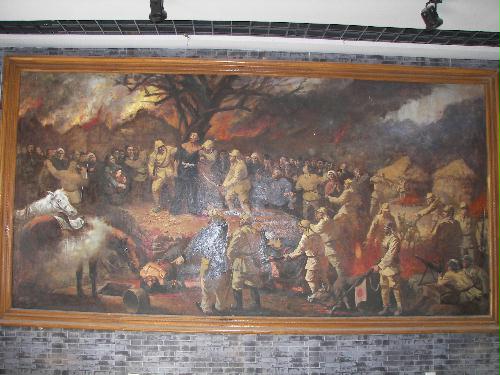 (一)莱东抗日战争纪念馆位于山东省莱芜市莱城区苗山镇南峪村村北300米处。 为缅怀铭记莱东县党政军民在抗日战争时期付出的巨大代价和做出的重要贡献,对广大群众特别是青少年一代进行爱国主义教育和革命传统教育,苗山镇南峪村在2005年建起“莱东抗日战争纪念馆”,由著名作家冯德英题写馆名。 该馆占地600多平方米,仿古风格为典型的“四合院”结构。院中立有一块醒目的巨石,喻意熊熊燃烧的“抗日烽火”。院内东、西厢房向北的墙壁上,嵌有南峪村14位革命烈士生平事迹的碑刻。屋面小黑瓦,檐头神兽装饰物,大红立柱,木质椽梁及老式窗棂,屋内墙壁为灰砖图案,皆透出古色古香韵味。该馆南厢房正中开有大门,正房北屋3大间,两侧各有一对称矮屋。西厢房为展馆第一部分,北屋为第二部分,都以大量真实、珍贵的图片和翔实的文字材料,详细记载反映了莱东广大军民抗击日寇的英勇事迹。东厢房内,除有一部分文字图片和结束语外,还有基本按李美秀一家已故亲人原形而特置的一组雕塑,比例与真人相符,给人以强烈的视觉效果。北屋西内墙上按照“南峪惨案”真实场景而创作的一巨幅油画作品,人物形象逼真,场景异常惨烈,把人们的思绪一下带入了那艰苦卓绝的抗战年代,更使人们增加了对日本侵略者在莱芜所犯罪行的愤慨。在北屋西侧房内,还有南峪兵工厂遗址浓缩图形,既有油画作背景,又有雕塑和仿真物品相配合,较好地再现了当年南峪军民在艰苦条件下,为前线部队赶制武器弹药的场景。 据悉,“莱东抗日战争纪念馆”共投资60多万元,主要是南峪村籍的革命老干部李美秀及李美林、李美翠“三姐妹”捐款所建,市、区有关部门及苗山镇政府给予了大力支持,南峪村“两委”干部做了大量工作,终使该馆建成。 (二)1941年元旦,日伪军分两路“围剿”在今苗山镇南峪村的兵工厂,兵工厂在得知情报后于元旦前夜转移。日伪军“围剿”扑空,把全村200多村民集合到村东河滩上,逼问兵工厂的下落。鬼子先后把村民李法林、李汉林当场刺死,把李玉瑞、李玉俊、李生田活活烧死,烧光全村所有房屋,又抓走50多名青壮年,至今这些人音讯皆无。这就是有名的“南峪惨案”。 01莱东抗日战争纪念馆? 02莱东抗日战争纪念馆烈士简介 03莱东抗日战争纪念馆布景 04莱东抗日战争纪念馆塑像 05莱东抗日战争纪念馆油画 06莱东抗日战争纪念馆展板 07莱东抗日战争纪念馆展板 08南峪惨案遗址 09南峪惨案遗址 | ||||||||||