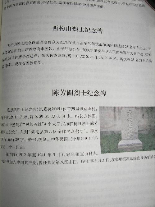 西杓山烈士纪念碑位于山东省莱芜市莱城区苗山镇西杓山村南180米长勺烈士亭中。 1952年,苗山镇原见马乡人民政府和当地群众,为纪念在抗日战争和解放战争期间,为了祖国的解放与敌人浴血奋战英勇牺牲的23名本乡同志,自愿为烈士立碑,以表千秋。上级为建碑拨款,乡干部赵金学、刘汉学组织本乡人民群众进行义务劳动,就地取材,将旧碑磨平,该碑高1.5米,厚20厘米,于1952年4月建成。最早在烈士亭西北的枫山脚下,后又迁到长勺之战碑旁。2007年农历七月七日莱城区及苗山镇出资新建长勺烈士纪念亭(亭长4.3米,宽4.3米,高8米),纪念碑迁至亭中。现在该碑宽73厘米、厚20厘米、高2.3米。 在2009年3月6日,苗山镇政府出资,在烈士亭东南面为烈士刘进同志建成一座纪念碑,该碑宽60厘米、高1.3米、厚10厘米,底座长1米,宽80厘米。 01西杓山烈士纪念碑 02西杓山烈士纪念碑 03《莱城区历史文化概览》中关于西杓山烈士纪念碑的记载 | ||||||||||